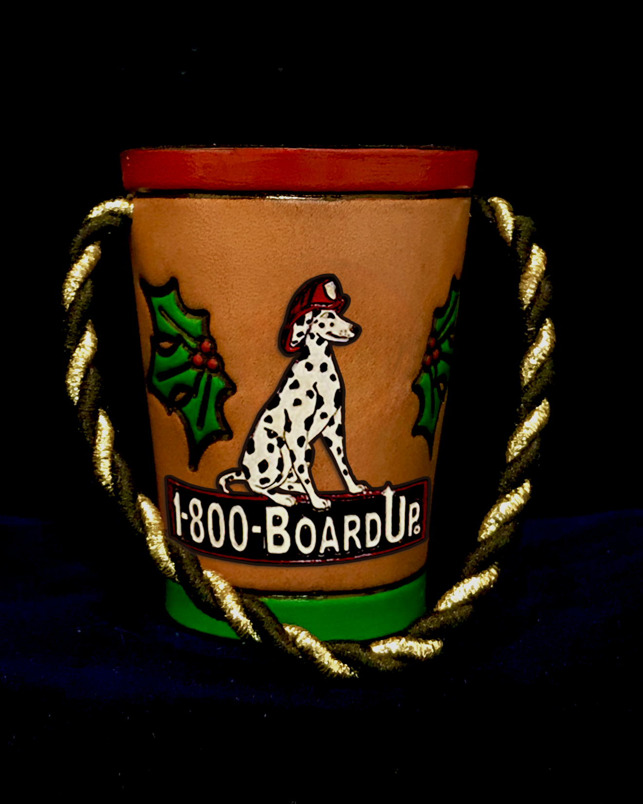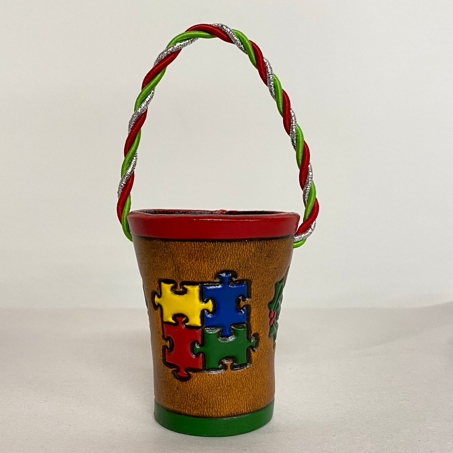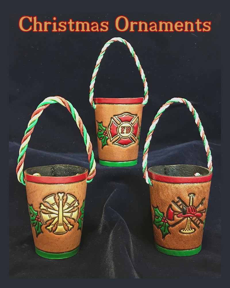 These mini leather fire buckets are the perfect gifts. They are sized to hold a piece of candy, a small toy, or a few dollars and make an excellent addition to any Christmas tree.