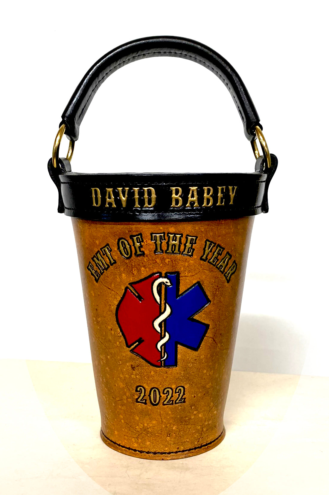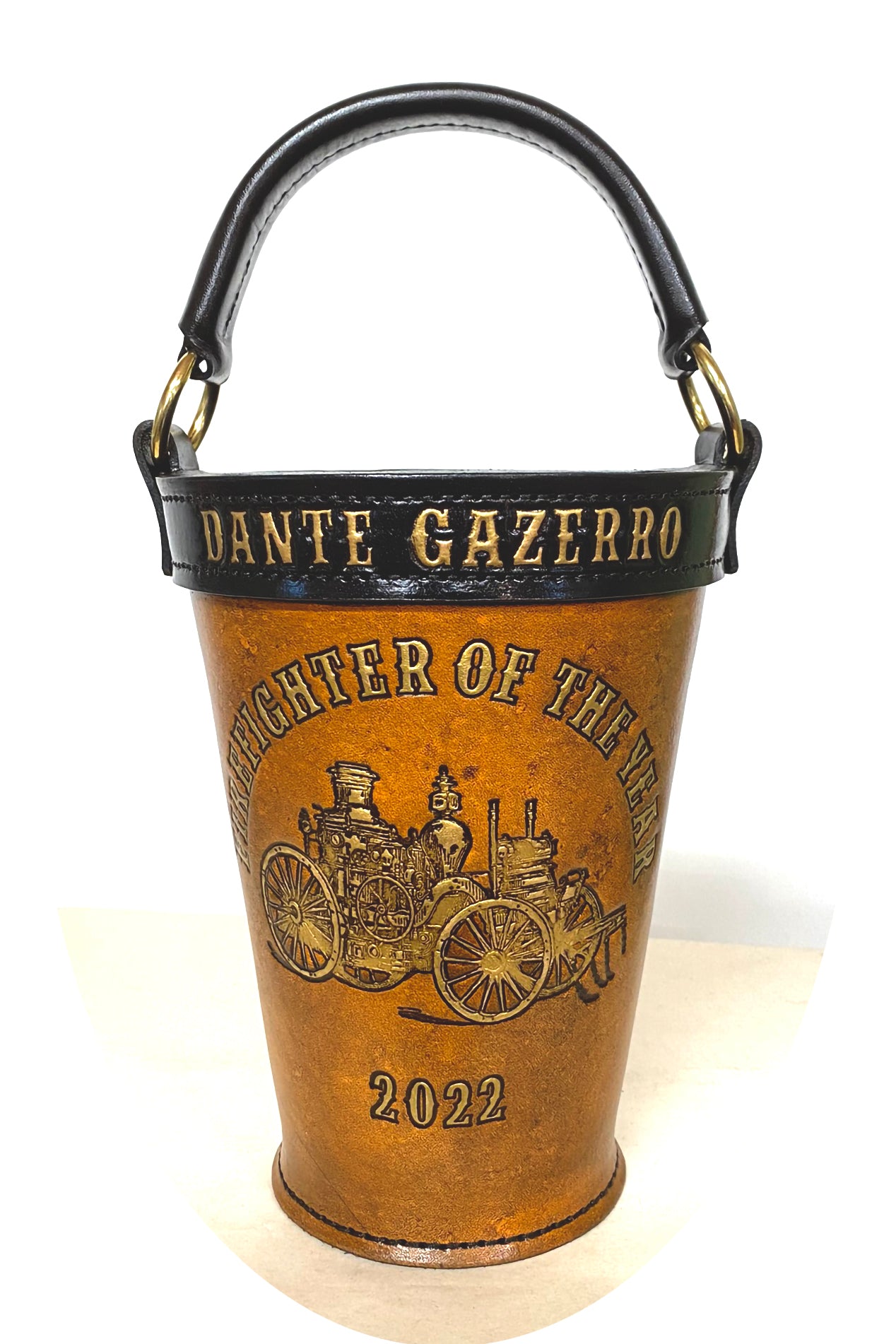 The Trophy Leather Fire Bucket is about 8 inches tall and 5-1/2-inches in diameter. It does not include banners (ribbons), and there is a limited amount space for text. If you like the banners or need more space for lettering, please consider the Heirloom Fire Bucket or the Legacy Fire Bucket.